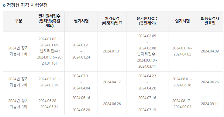 올해 2024년의 산림기능사 시험일정에 대해 알아보겠습니다. 1회시험은 이미 끝이 났습니다. 실기시험을 앞두고 있네요. 2회는 4월초, 3회는 6월 중순 필기시험이 예정되어있습니다. 대부분 상반기에 필기시험이 끝이 나게 되네요. 자격증을 준비하시는 분들은 하반기는 준비하시는 기간으로 삼고 상반기에 시험을 노려보시는 것이 좋을 듯합니다.