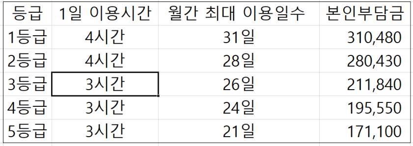 장기요양등급에 따라서 하루 이용 가능 시간이 정해져있습니다. 월간 최대 이용일수 또한 정해져있으니 위 표를 참고해주시기 바랍니다.