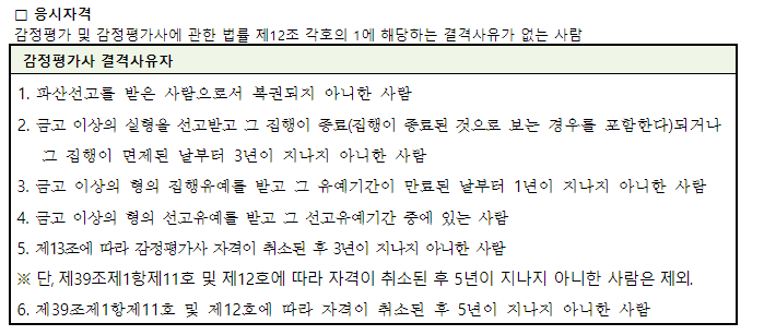 감정평가사는 응시자격 또한 가지고 있는데요, 특별히 어려운 조건은 아니지만 한번쯤은 확인해 볼만한 응시자격을 가지고 있으니 아래 이미지를 확인해주시기 바랍니다.