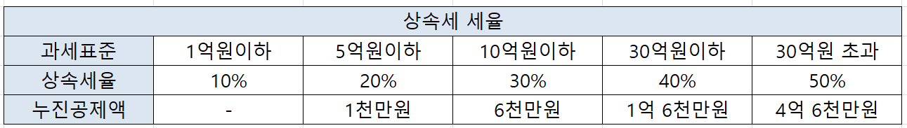 위표는 상속세율입니다. 요즘 1억이라는 돈이 크게 느껴지지 않는데요, 1억원이하 까지만 10%의 세율이며, 나머지는 세율이 뛰게 됩니다.