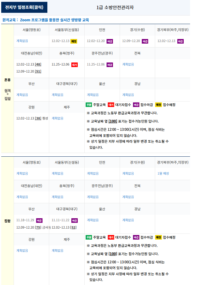 올해부터 소방안전관리자 1급 시험일정의 온라인 실시간 업데이트가 시작되었기 때문에 위 사이트에서 실시간으로 확인이 가능합니다. 아쉽게도 수도권은 11월은 모두 마감이고 12월 시험은 아직 오픈이 되지 않았기에 이 또한 잘 체크하여 시험을 신청할 수 있도록 해야할 것 같습니다