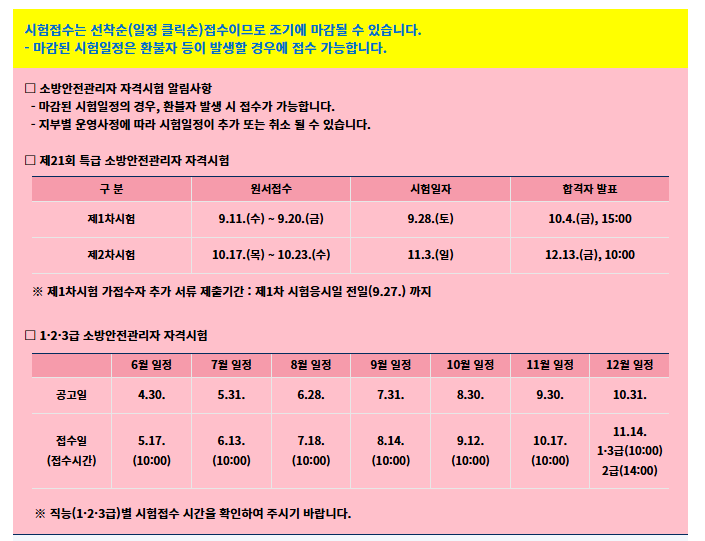 소방안전관리자 1급 응시자격을 살펴보았으니, 이제 시험일정을 알아보도록 하겠습니다. 현재 공개된 2024년 남은 소방안전관리자 1급 시험일정은 아래와 같습니다.