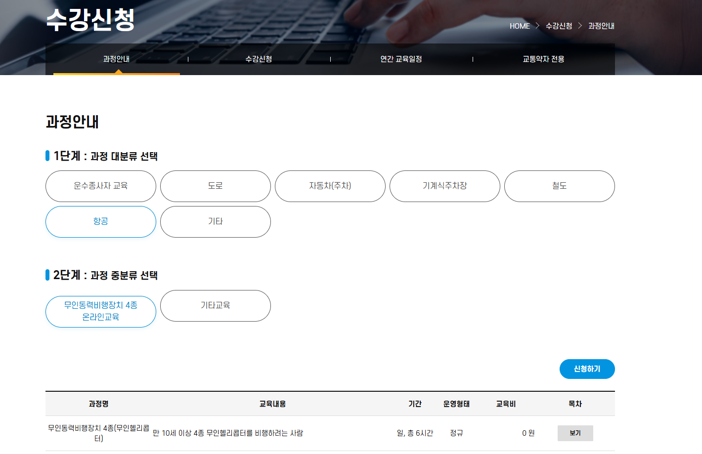 한국교통안전공단 홈페이지에서 '항공' 분야 교육을 선택하면, 4종 온라인 교육을 신청할 수 있습니다. 온라인으로 가능하며 어린아이도 교육을 들을 수 있습니다.