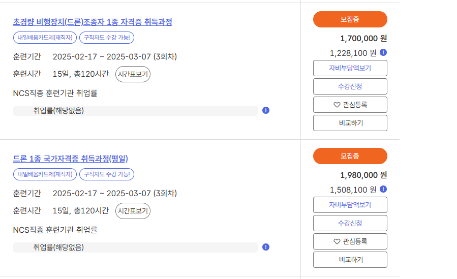 훈련과정 검색: 직업능력개발 -> 훈련찾기 -> 검색창에 '초경량비행장치' 또는 '드론' 검색