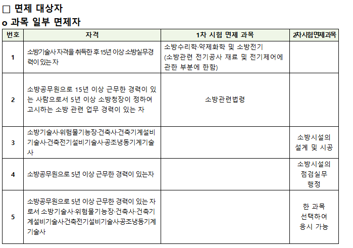 일부 과목 면제: 소방기술사, 소방설비(산업)기사 등 자격증 소지자