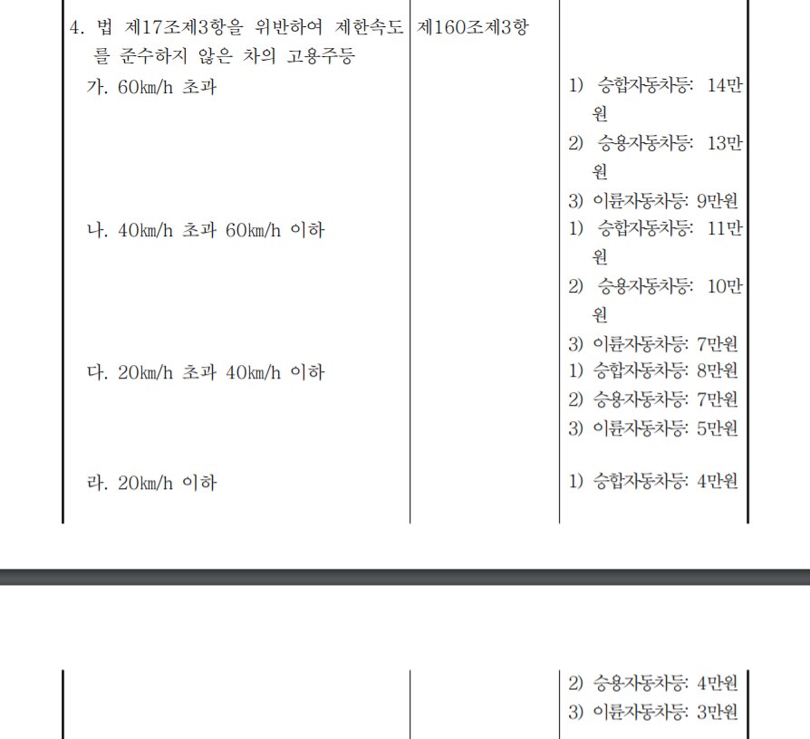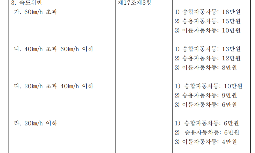 위 표를 봐주시면 아무래도 과속의 경우에는 얼마를 과속 했느냐에 따라서 그 과태료가 다르다는 것을 알 수 있습니다. 일반도로의 경우에 과속을 많이 하면 할 수록 과태료가 높으니 주의해야겠습니다.