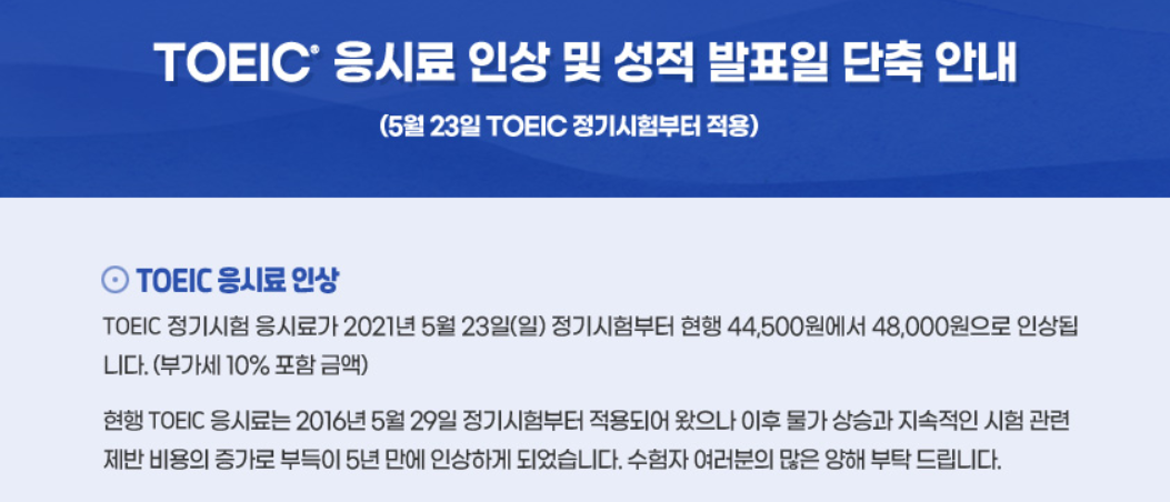 토익 정기 시험의 응시료가 44,500원에서 48,000원으로 7.2%인상됩니다. 아주 큰 금액은 아니라고 생각하실수있지만 그래도 여러번 보기 마련인 토익시험이라 상당한 부담이 될 수 밖에 없을거 같아요.
