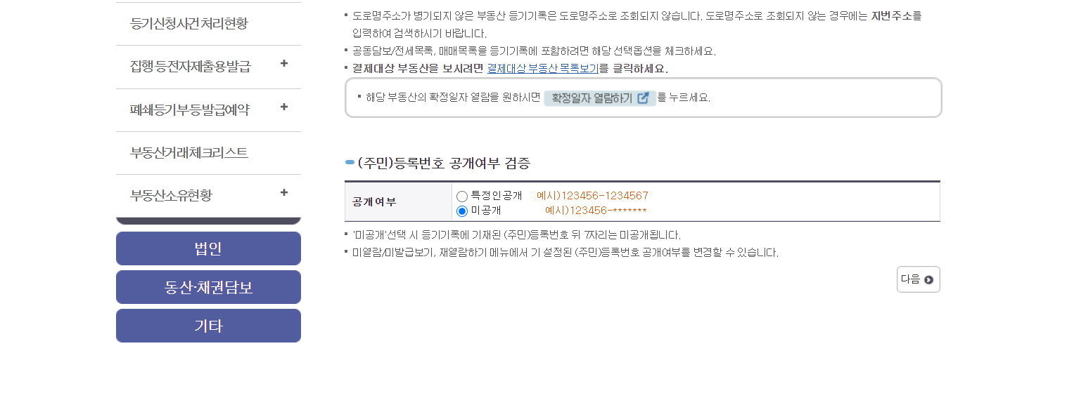 주민등록번호 공개 여부 검증도 눌러 주십니다. 특정인 공개나 미공개는 발급 사유에 따라 확인하시면 될 것 같아요. 확인 후 다음을 눌러 주시면 됩니다.