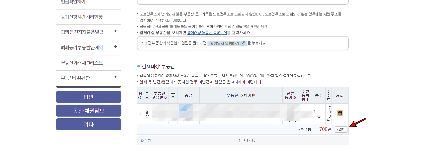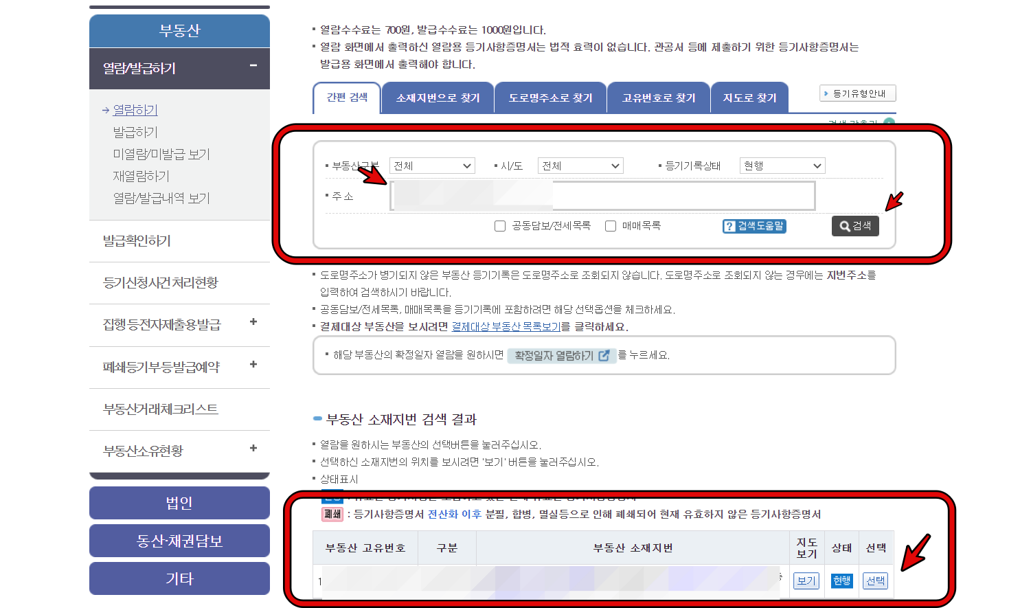 열람하기를 눌러주시면 이렇게 간편하게 주소로 또는 지도로 검색이 가능합니다. 부동산 주소를 입력한 후 검색을 누릅니다. 눌러주게 되면 해당 주소에 대한 검색 결과가 쭉 뜨게 됩니다.