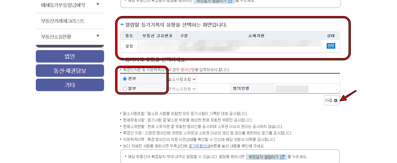 선택하게 되면 선택된 부동산에 대한 정보가 나옵니다. 유형을 선택해 주셔야 하는데 유형을 선택한 후에 다음을 누릅니다.