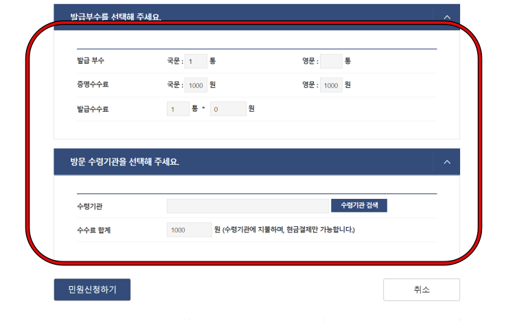그 후에는 발급부수를 선택하고 방문, 수령 기관을 선택하여 주면 됩니다.