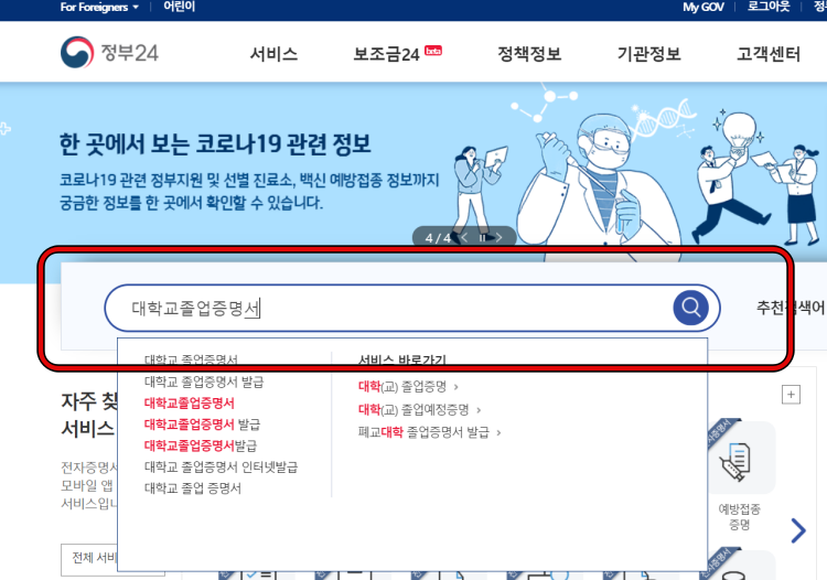 첫번째로는 정부 24를 통한 발급 방법이 있어요. 정부 24 서비스를 통해 대학교 졸업증명서를 발급받는 건 저도 이번에 처음 알게 된 사실이에요. 검색창에 정부 24를 검색해주세요! 아니면 제가 아래 추가해 놓은 링크를 타고 가셔도 됩니다!
