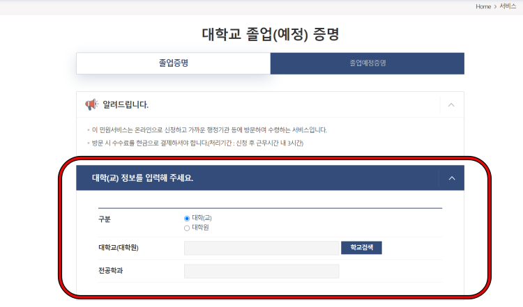 이렇게 사이트로 들어가 주신 후에 학교를 검색하면 해당 사이트로 이동하는 방식입니다. 즉 웹민원센터는 중간에서 사이트로 연결해주는 방식을 취하고 있는 것입니다. 물론 대학교 졸업증명서를 인터넷상에서 편리하게 출력할 수 있다는 점이 있습니다.