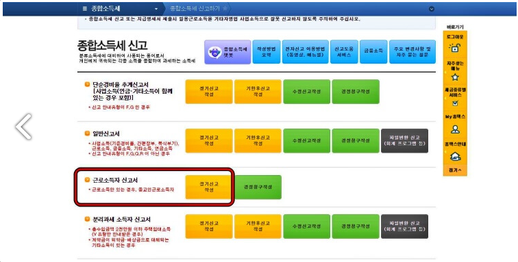 근로소득자 신고서 중 정기신고 작성 클릭
