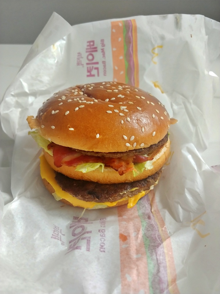 저는 집에서 먹을 때는 치즈를 한 장 추가해서 먹어요 그럼이게 바로 더블 치즈 빅맥이 아니겠어요? 더욱 풍부한 맛입니다. 오늘은 거기에 베이컨까지 추가되니 아주 맛있을 거 같아요. 패티 밑으로 슬며시 삐져나와있는 베이컨이 빅맥이 아닌 빅맥 베이컨임을 말해주고 있습니다.