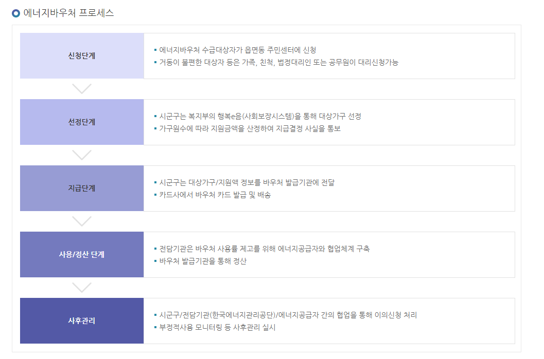 에너지 바우처는 국민 모두가 따뜻한 겨울을 보낼 수 있도록 에너지 취약계층을 위해 에너지 바우처(이용권)를 지급하여 전기, 도시가스, 지역난방, 등유, LPG, 연탄을 구입할 수 있도록 지원하는 제도입니다.
