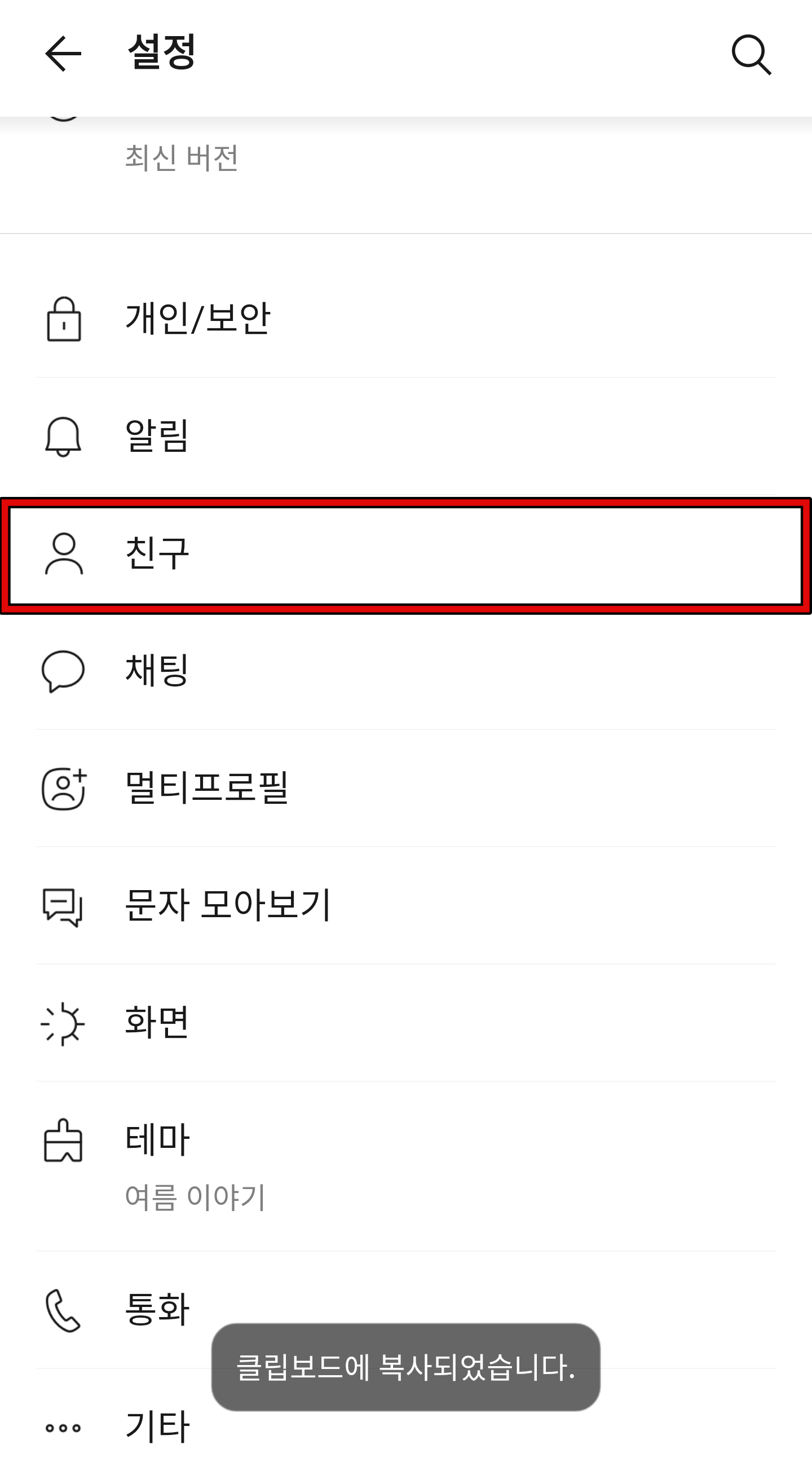 그러면 이렇게 다른 설정을 클릭할 수 있는데 여기서 전체 설정을 눌러 준 후 친구를 클릭해 줍니다.