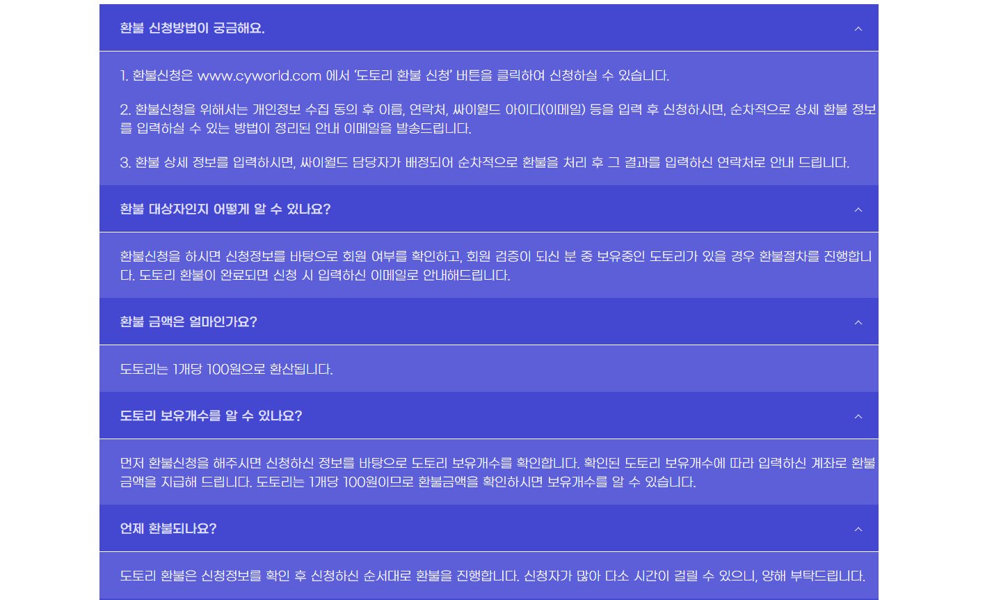 이번 싸이월드 부활을 준비하면서 남아있던 도토리 39억 원어치는 환불이 가능하다고 합니다. 그럼 어떻게 환불받을 수 있는지 한번 알아볼까요?