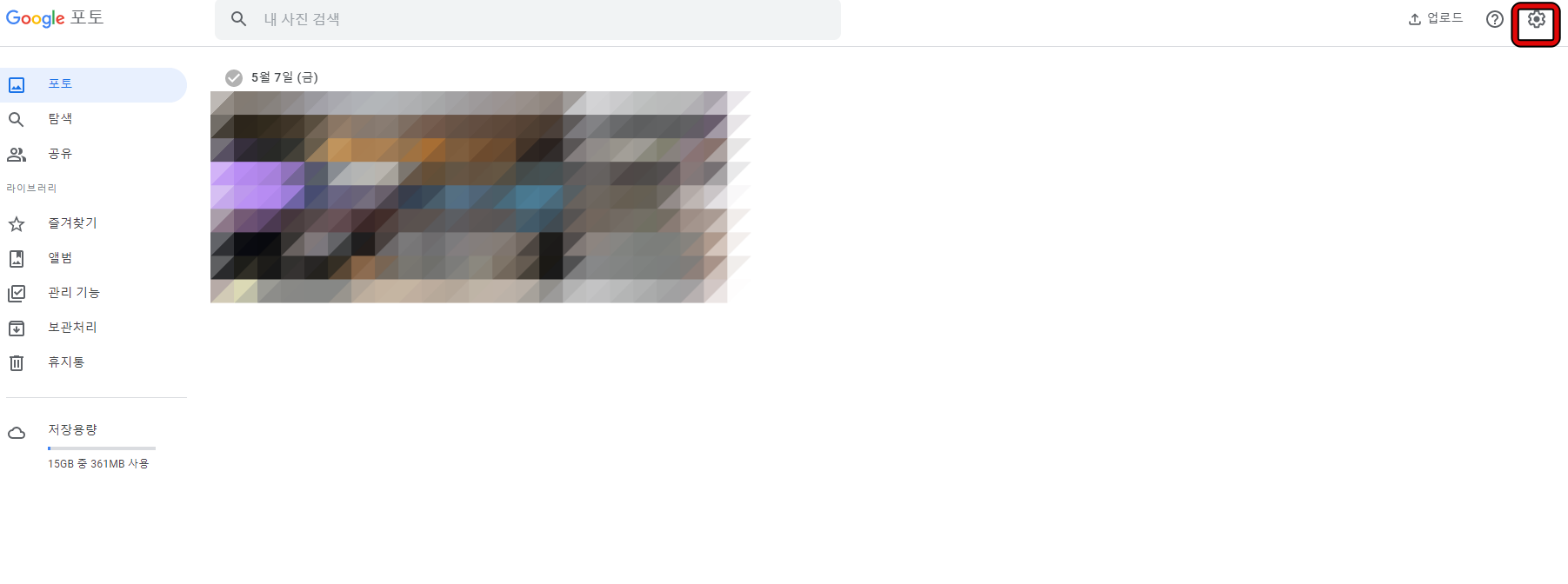 사진(포토)으로 들어와 주셨으면 아래와 같은 메인 메뉴가 생깁니다. 저는 2장의 사진뿐이어서 이 이미지로 대체합니다. 여기서 설정으로 들어가 주시면 됩니다. 오른쪽 상단에 보시면 톱니바퀴 모양이 있고 그 톱니바퀴를 클릭해주시면 됩니다.