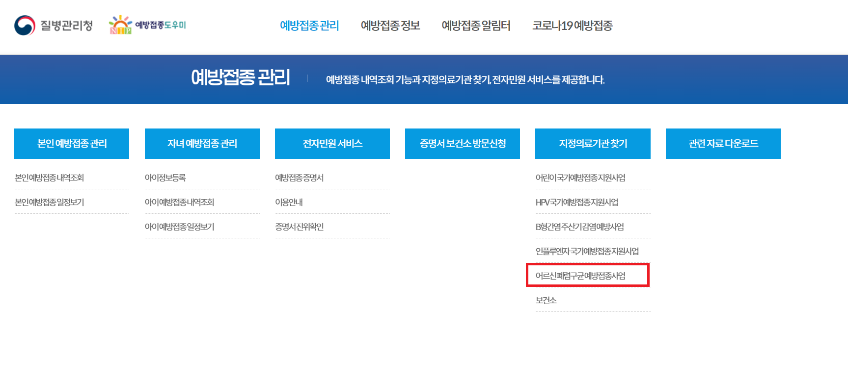 국가 예방접종 지정의료기관 찾기 어린이 국가예방접종 지원사업 HPV 국가예방접종 지원사업 B형간염 주산기 감염 예방사업 인플루엔자 국가예방접종 지원사업 어르신 폐렴구균 예방접종사업