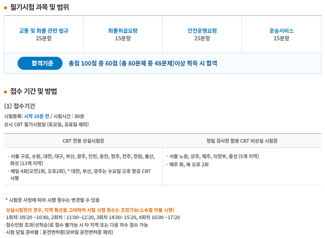 시험은 그다지 어렵지 않다고 합니다. 과목은 교통 및 화물자동차 운수사업관련 법규, 화물취급요령등의 과목이 나오며 총 80문제중 48문제 이상 맞출경우 합격하게 됩니다.