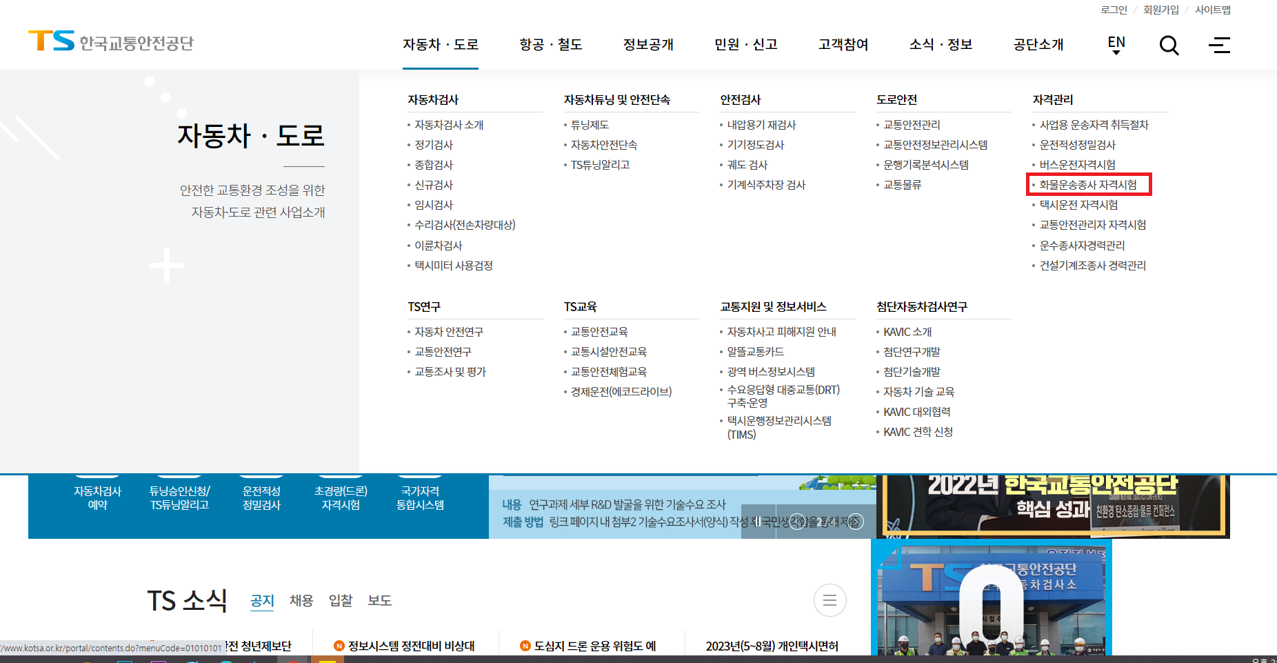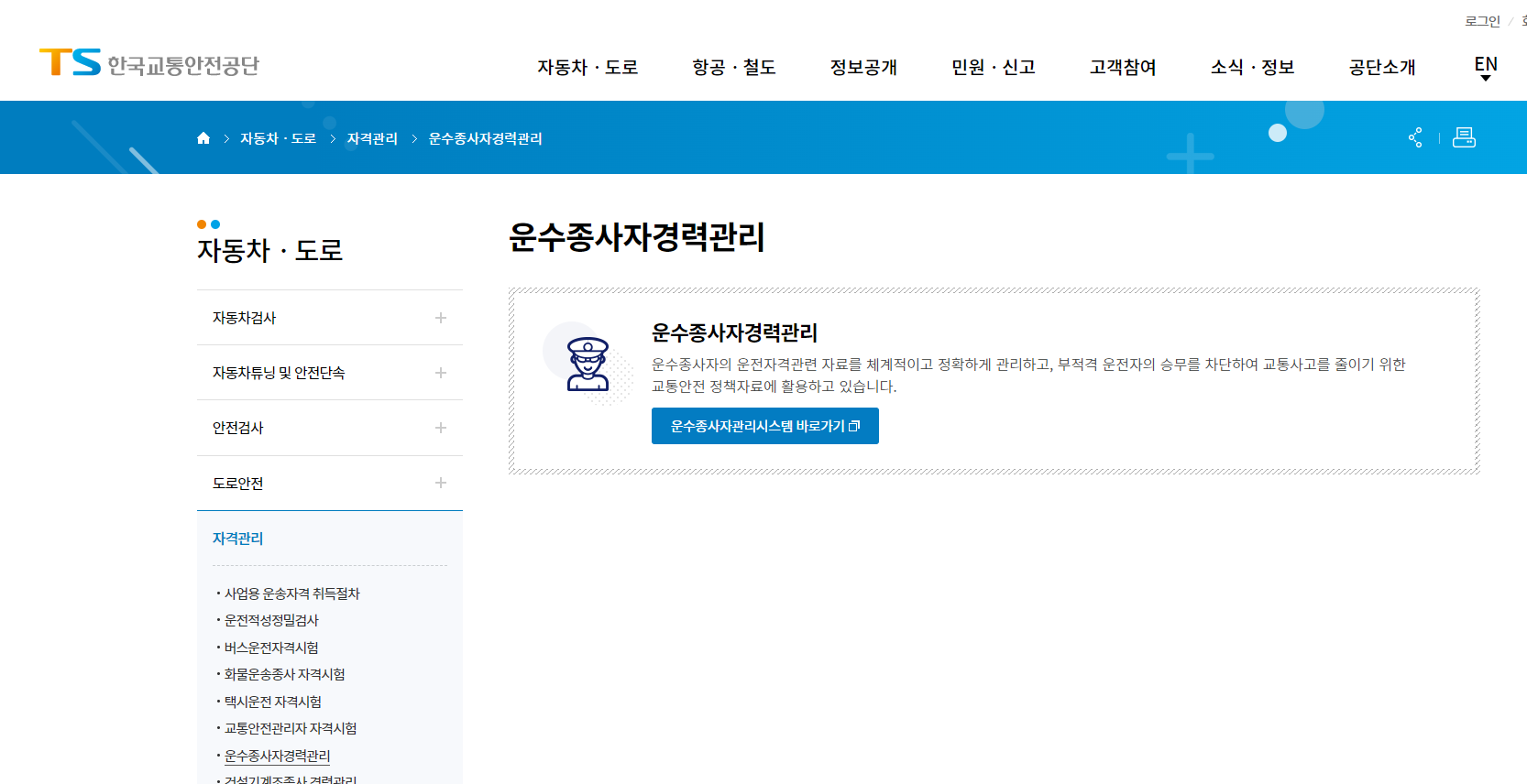 아래 이미지 처럼 자격관리 카테고리에서 화물운송종사자격시험을 클릭하여 신청해주시면 됩니다.