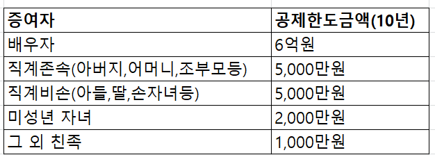 배우자의 경우 6억까지 증여세가 면제 되며, 직계존속은 5천만원입니다.