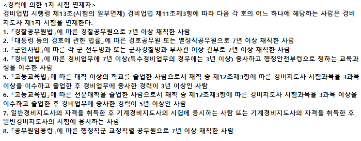 또한 1차 시험을 면제 받을 수 있는 사항도 존재 합니다. 바로 경력에 대한 우대인데요, 경찰, 경호공무원, 군사경찰등의 업무에서 7년이상 종사한 경우 1차 시험을 면제 받을 수 도 있습니다.