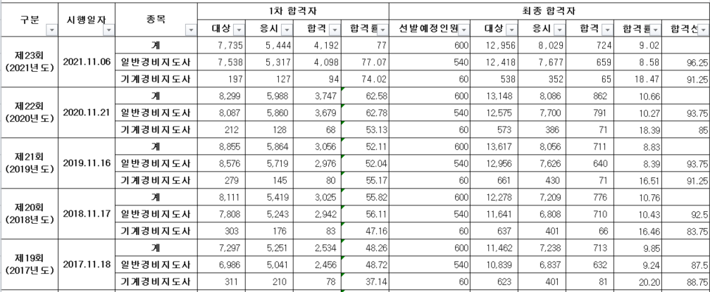 1차 시험의 경우 합격률이 70%대까지 올라와 있지만, 2차 시험의 합격률은 이보다 훨씬 낮아 10%를 밑돌고 있습니다. 제가 설명드리는 것은 일반경비지도사로 기계경비지도사보다 더 낮은 합격률을 보이고 있습니다. 대부분 10%아래 입니다.